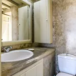 Die Villa in Ftelia verfügt über ein Badezimmer mit einer getrennten Toilette und einer Dusche. Ein Haartrockner und Handtücher sorgen ebenfalls für ein komfortables Erlebnis.